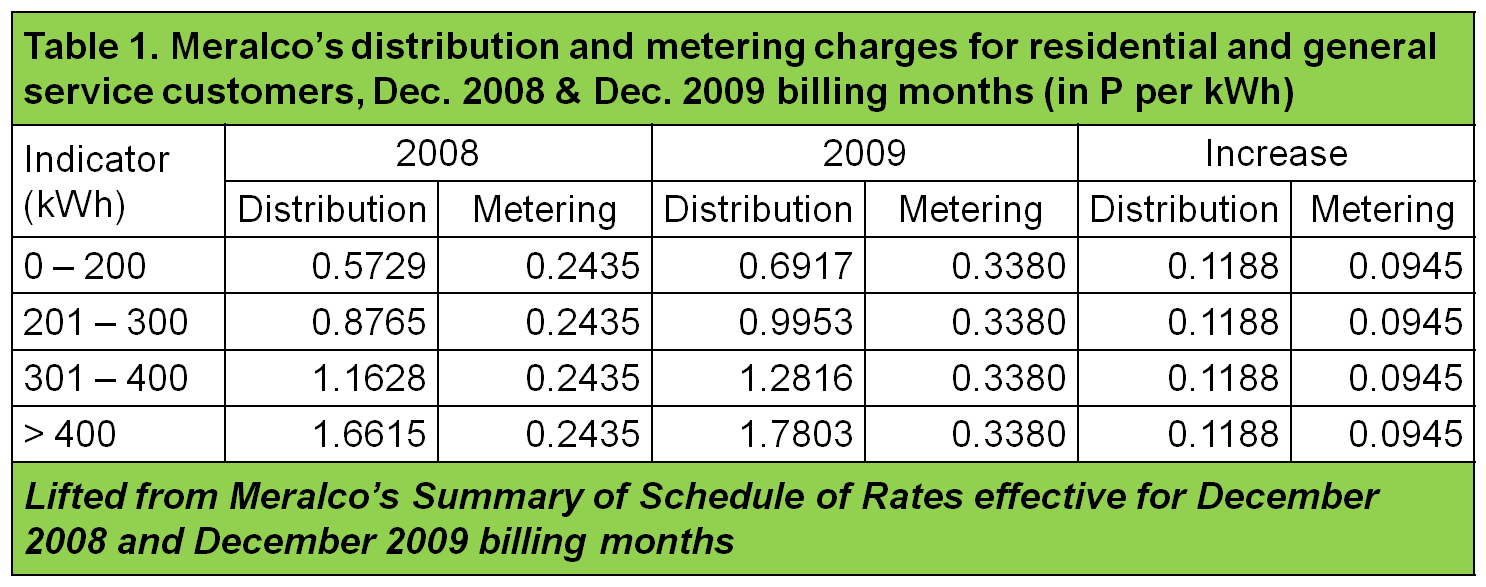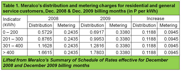 Prior to the latest increase in its distribution charge, Meralco has also raised its metering charge by 9.45 centavos per kWh between December 2008 and December 2009. (During the same period, the distribution charge also increased due to the first PBR. See Table 1)