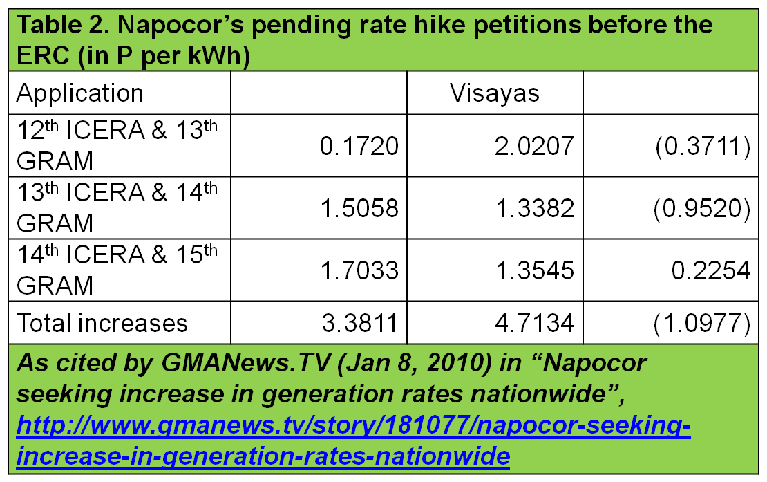 The ERC has yet to decide on two previous ICERA (12th and 13th) and GRAM (13th and 14th) applications by Napocor. If approved, customers in Luzon will bear a total increase of P3.3811 while those in the Visayas, P4.7134 per kWh. Mindanao consumers, on the other hand, will see a reduction of P1.0977 per kWh. Napocor explained that 90 percent of Mindanao’s power supply is generated by cheaper hydro-power, thus the rate reduction. (See Table 2)