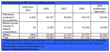 In the context of its fiscal woes, the Aquino administration welcomes these increases despite their harsh effect on consumers as they mean more VAT collections for the government. In fact, oil and electricity are the two largest sources of VAT revenues, increasing in direct proportion with rising pump prices and monthly electricity bills. From November 2005 (when RA 9337 was implemented) to December 2009, the VAT burden from oil and power has reached P239.94 billion, or more than 65.3 percent of the total revenues (P367.28 billion) generated by RA 9337.