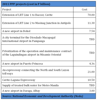 An estimate by National Economic and Development Authority (Neda) Director General Cayetano Paderanga Jr. shows that all in all, government is targeting some P740 billion worth of infrastructure projects through PPPs. An initial list of 10 priority PPP projects worth at least P127.7 billion for 2011 has been released by government, with the expansion of the mass rail transit system accounting for 54.8 percent of the amount. (See Table)