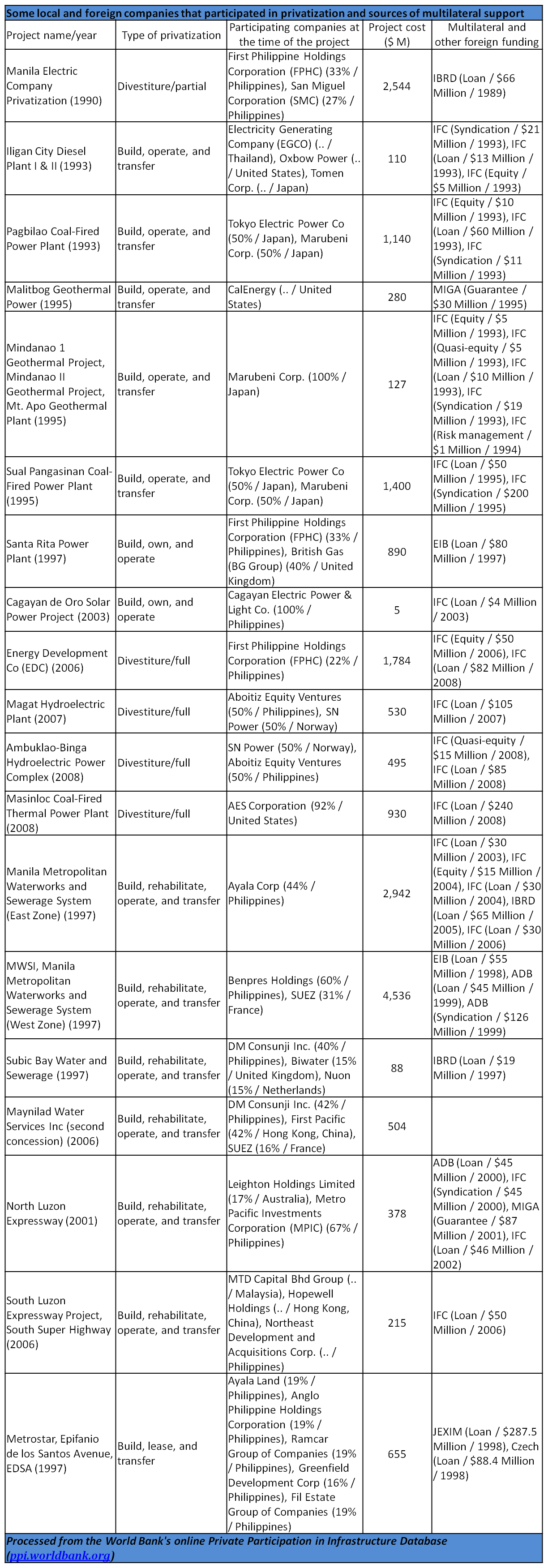 In many cases, they have also partnered with investors from the US, Europe, Japan, and other foreign countries in these PPP projects. Multilateral lending institutions like the World Bank through its various units – International Finance Corp. (IFC), Multilateral Investment Guarantee Agency (MIGA), and the International Bank for Reconstruction and Development (IBRD), as well as the ADB and others have also provided them with loans. At the end of the day, all the costs of the PPP ventures are shouldered by the people through user fees and debt servicing. (See Table below)