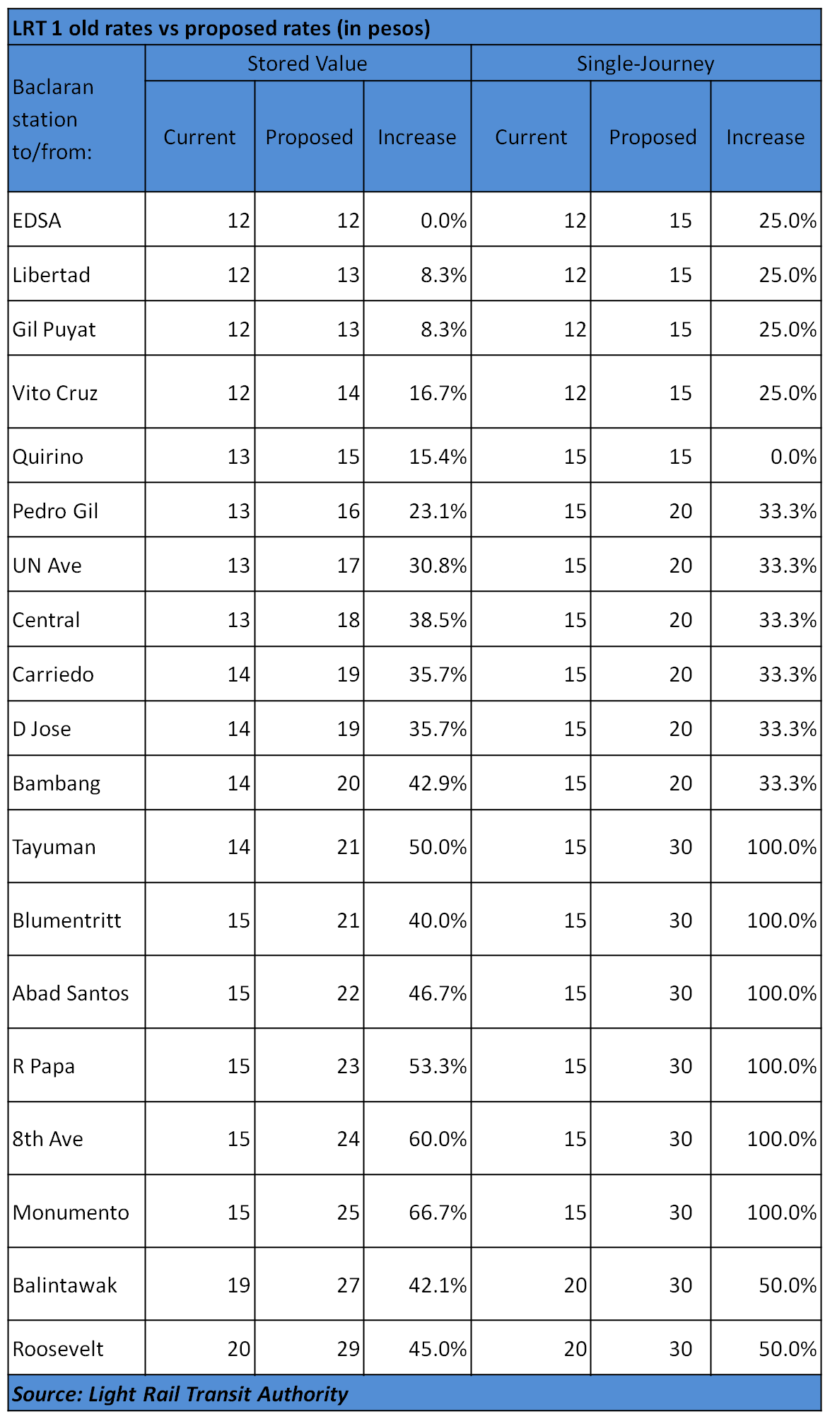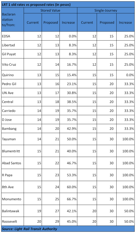 The second column in the table below shows the average distance that a commuter usually travels (based on data from the DOTC). The proposed fare, in the fourth column, is the new P11-boarding fee approved by the LRTA plus the average trip length (with a proposed rate of P1 for every kilometer).