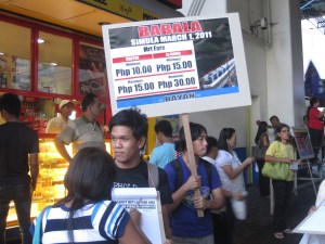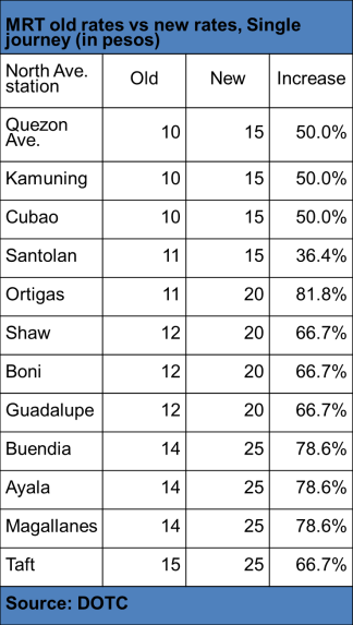 No new fare matrix has been released yet for MRT although transportation officials said they will also apply the P15 (minimum) – P30 (maximum) fare structure used in LRT 1 and 2. This means that a train ride from MRT’s North Avenue station to Quezon Avenue will increase by 50 percent (P10 to P15) while the fare from North Avenue to Taft Avenue will double (P15 to P30). (Update: The fare matrix for MRT released by the DOTC shows that the maximum fare would be P25 from the current P15. The highest increase would be felt by commuters riding from North Avenue to Ortigas wherein the fare will increase from the current P11 to P20, or an 82 percent hike. See Table below for details.)