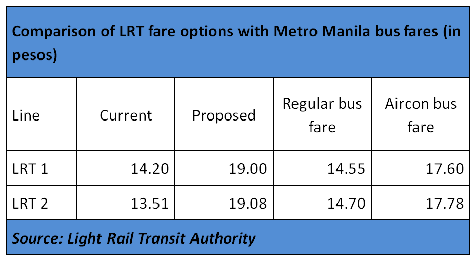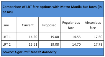 The new fare rates will also make an LRT train ride more expensive than the average fare for ordinary and aircon buses contrary to claims by Malacanang. (See Table)