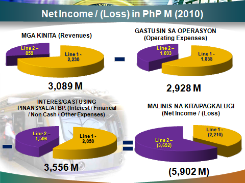 Consider, for instance, the slides below which I lifted from the Powerpoint presentation of the DOTC on MRT. The first slide shows that the total income of the MRT in 2010 was P1.916 billion, of which P1.904 billion were generated from passenger fares.