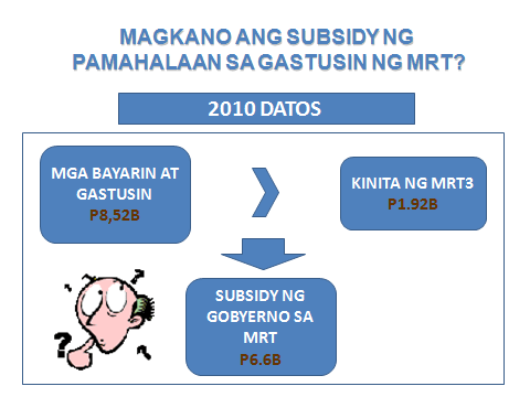 However, as shown in the next slide, MRT expenses reached P8.52 billion during the same year which the DOTC said resulted in a government subsidy of P6.6 billion to bridge the shortfall in revenues (that was only P1.92 billion).