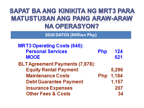 The next question is what makes up the P8.52 billion in expenses? The third slide below breaks down the P8.52 billion (the figures in the slide add up to P8.52 billion) and shows that operating costs comprise only 7.6 percent of the total and maintenance costs comprise only 13.9 percent. A huge 61.1 percent represents the Equity Rental Payment, which refers to DOTC payments for the 15 percent return on investment (ROI) that government guaranteed private investors in their Build Lease Transfer (BLT) agreement. Another 13.6 percent represents debt payments that government also guaranteed in the BLT.
