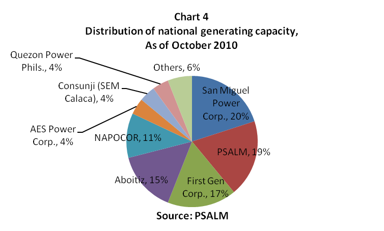 Government through NAPOCOR and PSALM has 30 percent. (See Chart 4) SMC’s rise as a major player in the power industry is truly phenomenal considering that it has only started venturing in the industry in 2008.