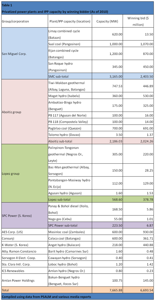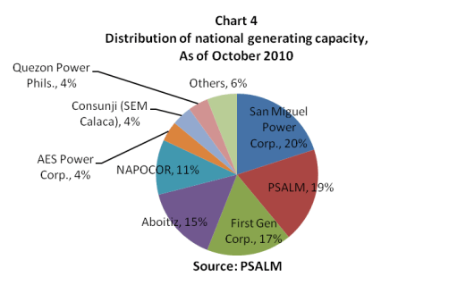 In terms of overall generating capacity, the restructured Philippine power sector is now dominated by just three companies – San Miguel Power Corporation (20 percent), Lopez-owned First Gen Corporation (17 percent), and the Aboitiz group (15 percent).