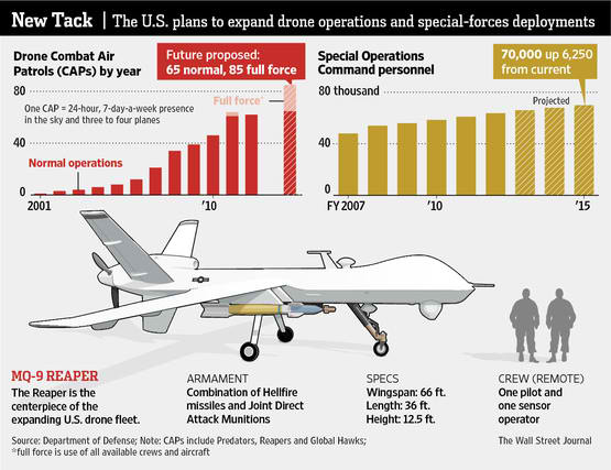 In its budget request for fiscal year 2013, the US Defense department is calling for a 30% increase in its fleet of armed drones in the coming years, according to a report by the Wall Street Journal (WSJ). Quoting Defense officials, the WSJ said that from the current 61 drone combat patrols around the clock, with up to four drones in each patrol, Defense Secretary Leon Panetta intends to “operate 65 combat air patrols constantly with the ability to temporarily surge to 85 combat air patrols.” US defense officials are also planning to deploy more special operations teams at a growing number of “lily pads” or forward operating bases (FOBs). The US plans to increase special forces by 10%, from 63,750 this year to 70,000 by 2015. (See illustration below)