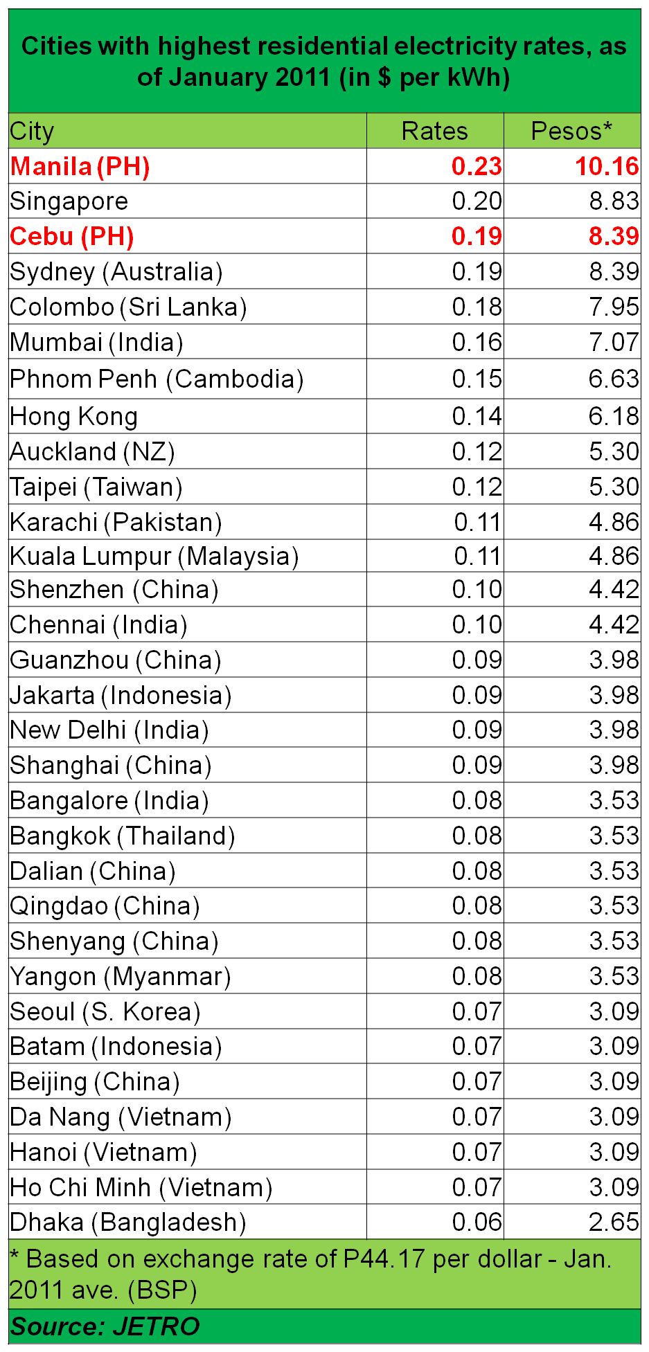 Aquino, however, did not mention one very important fact. Mindanao power is “cheap” only because the country has the highest electricity rates in Asia. In a survey conducted by the Japan External Trade Organization (JETRO), Manila posted the most expensive residential rate (P10.16 per kWh), while Cebu (P8.39) is ranked third (Singapore ranked second with P8.83). JETRO conducted the survey in January 2011 to compare investment-related costs, including electricity, in 31 major cities in Asia and Oceania. (See the table at the end of this article for the complete list; Download the JETRO survey here)