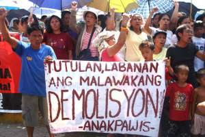 In the National Capital Region (NCR) alone, the Demolition Watch reported that some 16,000 families in 20 urban poor communities have already been displaced in the first two years of the Aquino administration. The Bagong Alyansang Makabayan (Bayan) – NCR said that the region hosts some 14 large PPP projects, including business districts and parks, port privatization, etc. which could displace as much as 1.4 million poor families.
