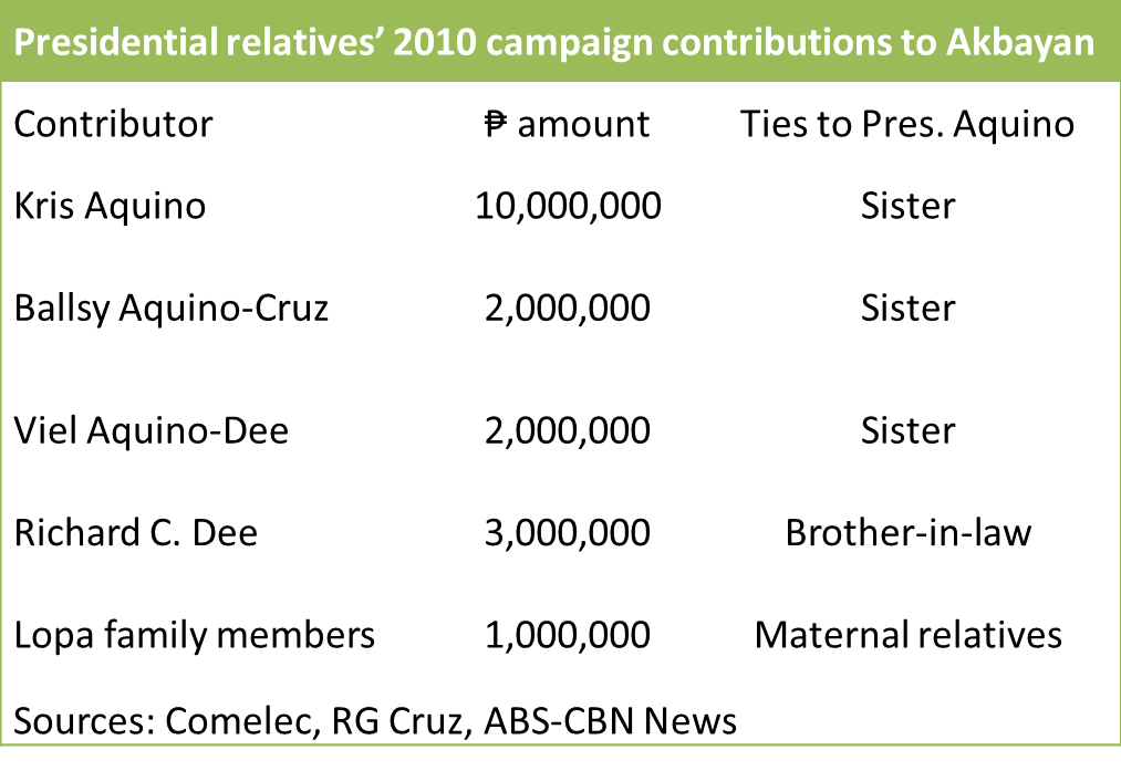 Akbayan actually received ₱18 million in campaign funds for the 2010 elections from President Aquino’s relatives. RG Cruz of ABS-CBN News reported that Akbayan, which is facing disqualification complaints before the Commission on Elections (Comelec), received ₱14 million from presidential sisters Kris (₱10 million), Ballsy (₱2 million) and Viel (₱2 million). But Akbayan also received funds from Viel’s husband Richard Dee (₱3 million) and Aquino’s maternal relatives from the Lopa family (₱1 million). Thus, the total amount that Akbayan directly received from presidential relatives could reach at least ₱18 million.