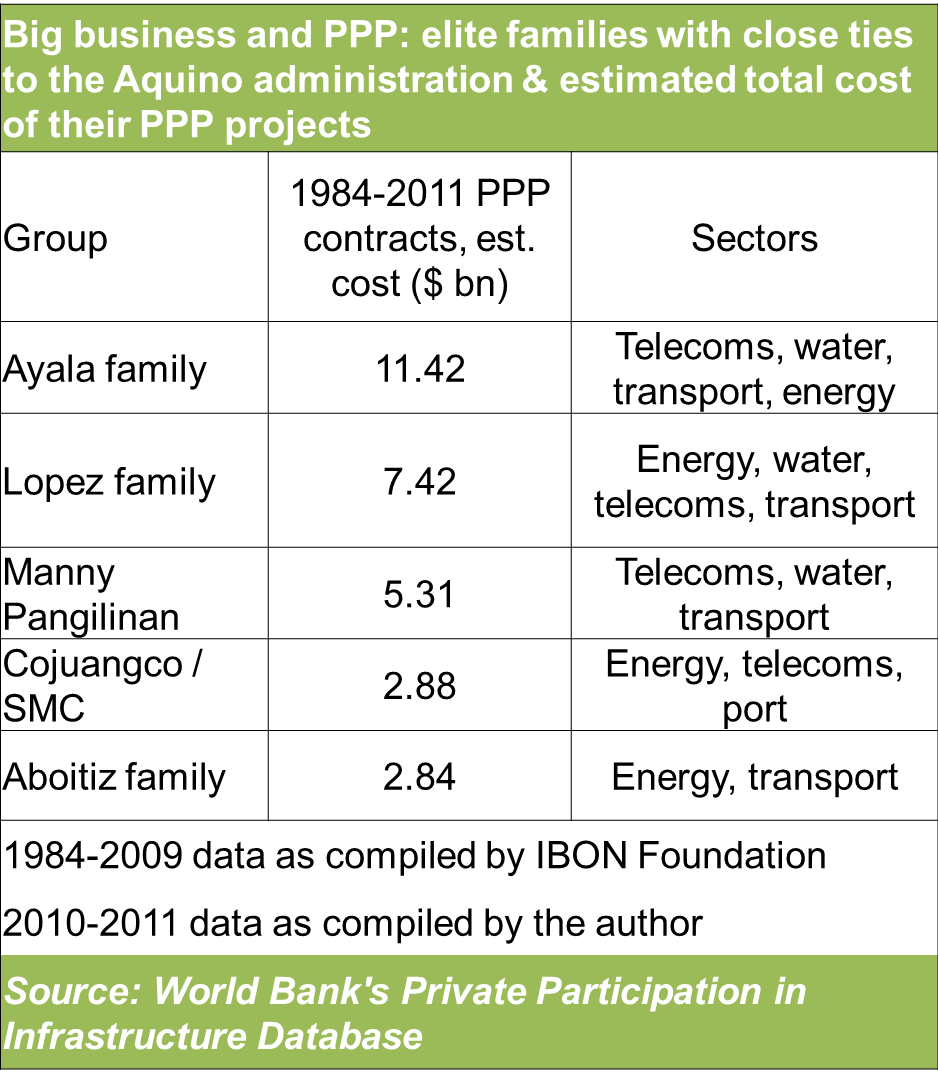 These utilities are controlled by the country’s richest clans and individuals who are closely associated with Aquino such as presidential uncle Danding Cojuangco and political supporters Manny Pangilinan and the Ayala family. Aside from electricity and water utilities, they also control other key infrastructure such as toll roads, telecoms and power generation. Together with other close Aquino allies like the Lopezes, Aboitizes and Consunjis, among others, these groups have positioned themselves to further expand their business empire through Aquino’s PPP scheme.