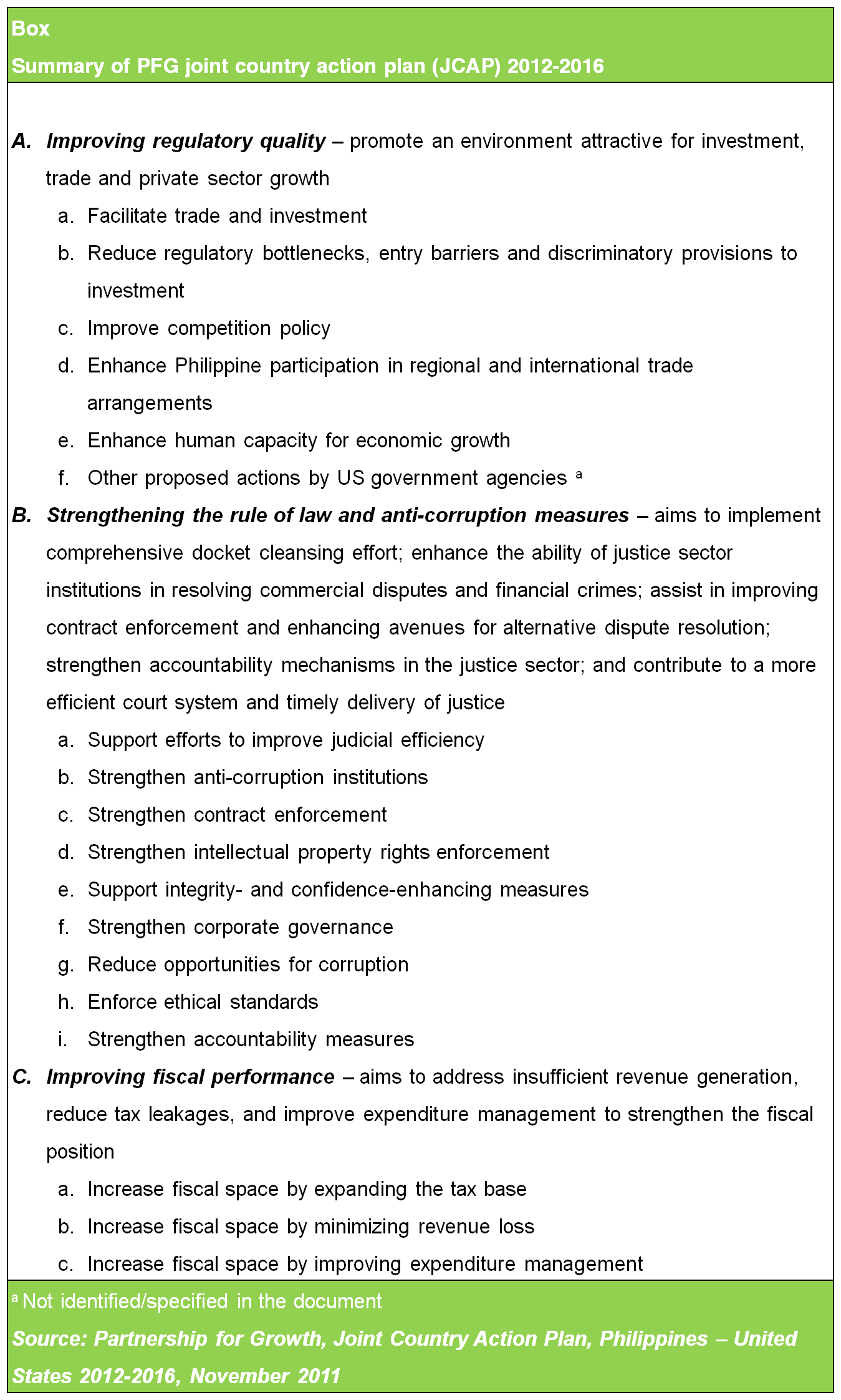 Under the PFG, the US intends to deepen its role in national policy making such as through the five-year Joint Country Action Plan (JCAP) which identified priority areas for policy reforms in the Philippines, including trade and investment liberalization, deregulation, effective enforcement of contracts with private business (such as those engaging in PPP) as well as fiscal and judicial reforms. (See Box)