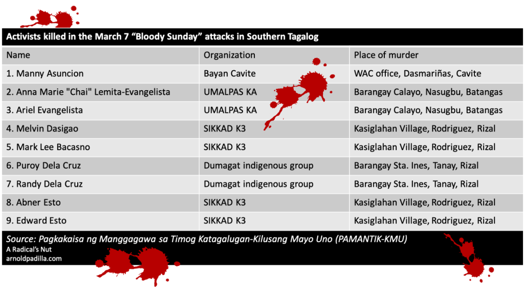 On Mar 7, yet another wave of coordinated arrests and alleged extrajudicial killings struck the activist and cause-oriented groups in the country. According to media reports, nine were killed and six were arrested in simultaneous operations carried out by the Philippine National Police (PNP) in Southern Tagalog. The victims are activists from organizations of workers, urban poor, farmers and fishers, as well as from human rights groups based in Batangas, Cavite, Laguna and Rizal provinces.