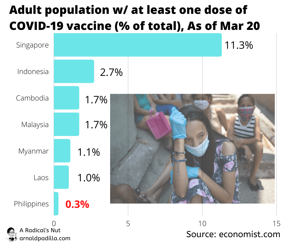 As of today, only 0.3% of the Philippine adult population has at least one dose of COVID-19 vaccine – the worst among Southeast Asian countries with high levels of cases. Poorer neighbors like Cambodia, Myanmar and Laos have even much better vaccination numbers. ###