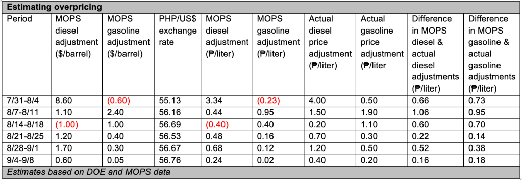 To illustrate using the table above, during the Jul 31 to Aug 4 trading days, the price of MOPS diesel increased by ₱3.34 per liter, but the price adjustment announced by the oil firms on Aug 8 was ₱4 per liter or an overpricing of ₱0.66 per liter. During the same period, MOPS gasoline went down by ₱0.23 per liter, but the oil companies increased the local pump price by ₱0.50 per liter or an overpricing of ₱0.73 per liter. This small sampling shows two instances when oil companies hiked prices even when MOPS prices declined. Aside from the Aug 8 case of gasoline prices, MOPS diesel also fell by ₱0.40 per liter during the Aug 14-18 trading days, but oil firms implemented a diesel price hike of ₱0.20 per liter on Aug 22 or an overpricing of ₱0.60 per liter. In the week of Sep 4-8, MOPS gasoline practically did not move, but oil firms still hiked local gasoline pump prices by ₱0.20 per liter on Sep 12.