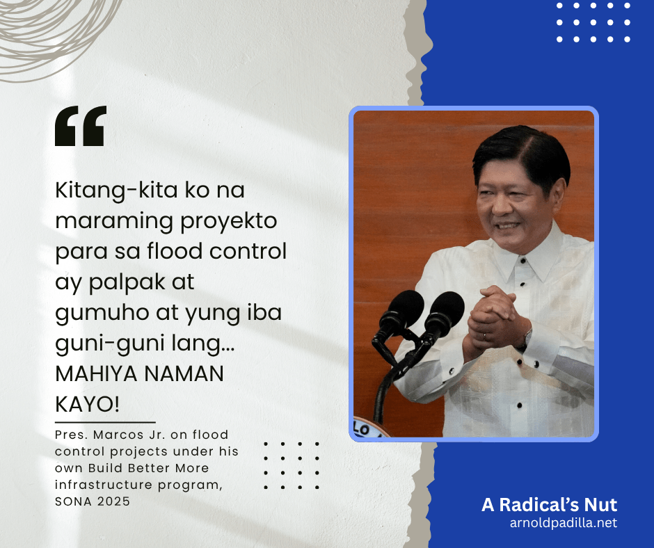 The most obvious irony is that the flood control projects are his initiatives under the Build Better More infrastructure program, and that some of the public officials involved in the corruption behind the defective projects are the same ones who are applauding the President enthusiastically in the plenary hall. According to the Department of Public Works and Highways (DPWH), the Marcos Jr. administration has built around 9,856 flood control projects between June 2022 and May 2025. Approximately 5,700 projects are still ongoing and are expected to be completed by 2026. Between 2023 and 2025, the Marcos Jr. government has allocated a substantial P700 billion for these flood control projects in the national budget.
