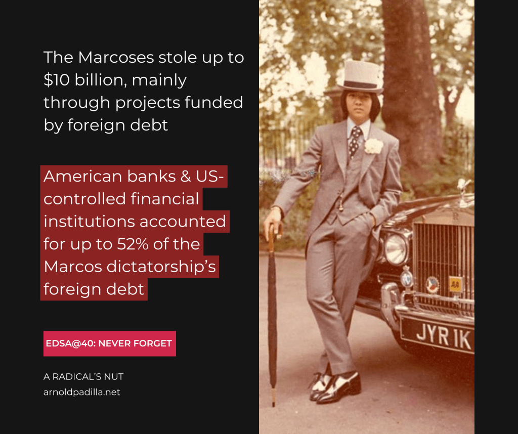 American banks and U.S.-controlled financial institutions accounted for more than half of the Philippines’ foreign debt accumulated throughout the Marcos Sr. regime. Using available data, we can estimate that the U.S., directly through bilateral government loans and private American banks, and indirectly through U.S.-controlled multilateral financial institutions, provided the Marcos Sr. dictatorship up to $14.5 billion in loans, or as high as 52% of the total foreign debt that the Philippines has incurred by the time the dictator was forced to leave Malacañang by the EDSA People Power.